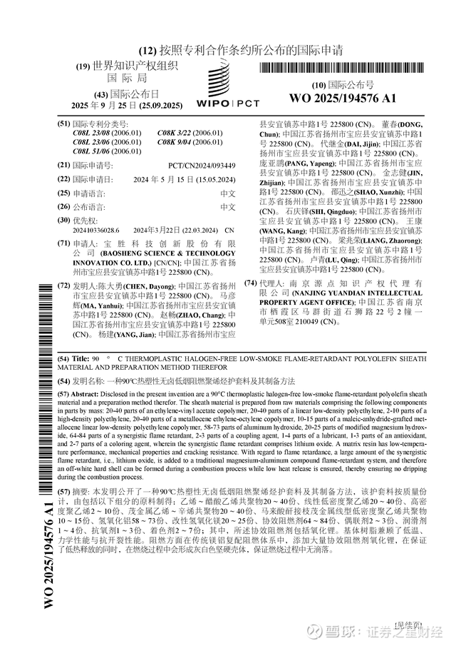 证券之星消息,根据企查查数据显示宝胜股份(600973)公布了一项国际专利申请,专利名为“一种90℃热塑性无卤低烟阻燃聚烯烃护套料及其制备方法”,专利申请号为PCT/CN2024/093449,国际公布日为2025年9月25日。