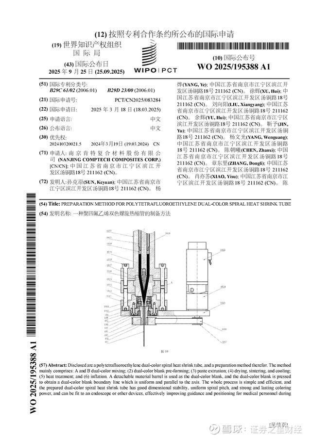 证券之星消息,根据企查查数据显示肯特股份(301591)公布了一项国际专利申请,专利名为“一种聚四氟乙烯双色螺旋热缩管的制备方法”,专利申请号为PCT/CN2025/083284,国际公布日为2025年9月25日。