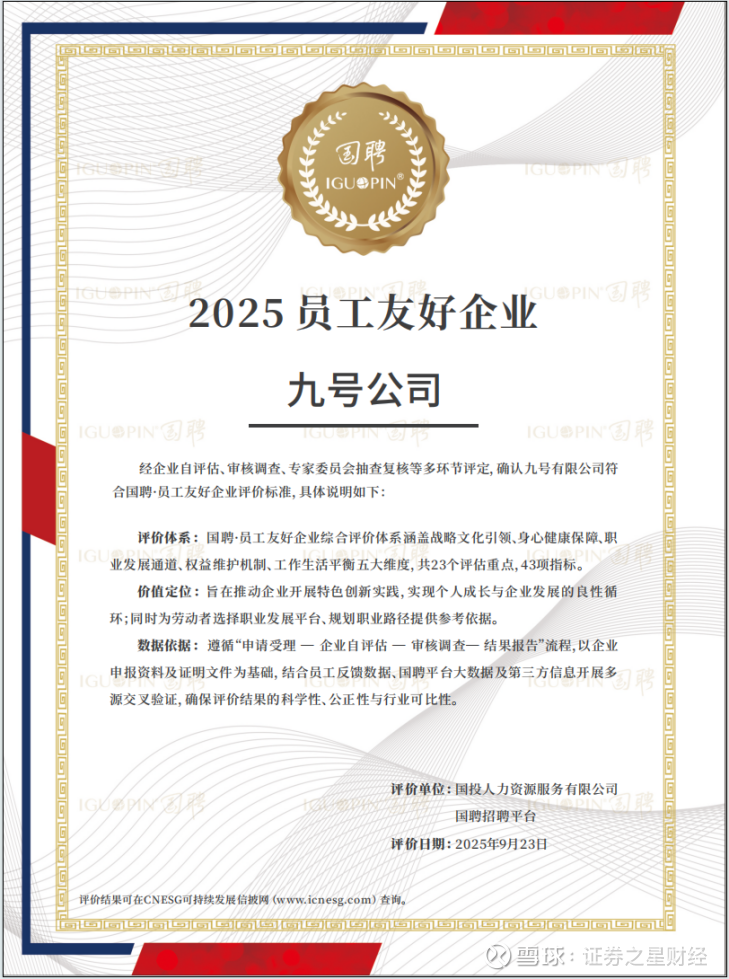 近日,由国投人力主办的“城企协同·共促就业友好”发布会在北京举行,正式推出国聘“就业友好城市”及“员工友好企业”双评价项目。九号公司在本次活动中成功入围首批“国聘·员工友好企业”,并与七家行业领先企业共同发起“员工友好企业行动倡议”。此次入围和倡议工作由公司证券事务部与集团人力行政中心牵头完成,确保了九号公司在活动中的高质量亮相。