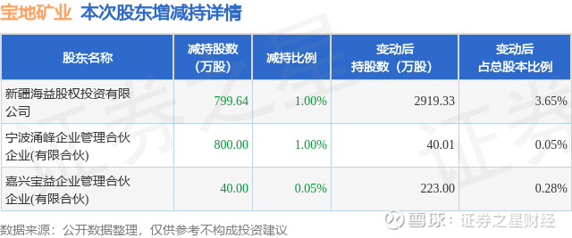 证券之星消息,9月28日宝地矿业发布公告《宝地矿业:新疆宝地矿业股份有限公司股东减持股份结果公告》,其股东嘉兴宝益企业管理合伙企业(有限合伙)、宁波涌峰企业管理合伙企业(有限合伙)、新疆海益股权投资有限公司于2025年7月9日至2025年9月28日间合计减持1639.64万股,占公司目前总股本的2.0496%,变动期间该股股价上涨4.41%,截止9月26日收盘报6.63元。