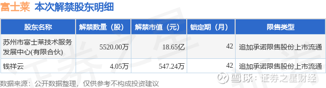 证券之星消息,根据市场公开信息整理,富士莱(301258)于9月29日将有5524.05万股限售股份解禁,为公司追加承诺限售股份上市流通,占公司总股本60.26%。(本次数据根据历史公告整理得出,实际情况以上市公司最新公告为准)本次解禁后,公司还有255.75万股限售股份,占总股本2.79%。具体如下图所示: