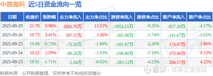 9月29日的资金流向数据方面,主力资金净流入2681.76万元,占总成交额13.52%,游资资金净流出1854.55万元,占总成交额9.35%,散户资金净流出827.2万元,占总成交额4.17%。