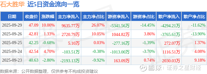 证券之星消息,石大胜华9月29日涨停收盘,收盘价47.09元。该股于9点30分涨停,3次打开涨停,截止收盘封单资金为8577.05万元,占其流通市值0.9%。