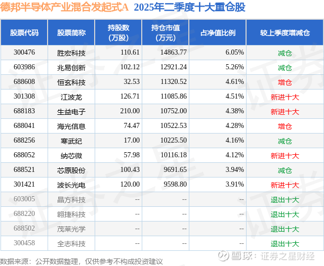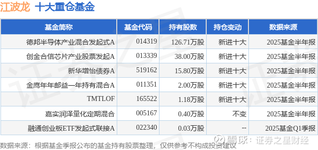 根据2025基金半年报公募基金重仓股数据,重仓该股的公募基金共6家,其中持有数量最多的公募基金为德邦基金的德邦半导体产业混合发起式A。德邦半导体产业混合发起式A目前规模为3.58亿元,最新净值1.8491(9月26日),较上一交易日下跌3.43%,近一年上涨129.7%。该公募基金现任基金经理为雷涛。雷涛在任的基金产品包括:德邦稳盈增长灵活配置混合A,管理时间为2023年3月29日至今,期间收益率为-20.8%;德邦福鑫灵活配置混合A,管理时间为2023年10月13日至今,期间收益率为7.88%;德邦科技创新一年定开混合A,管理时间为2023年10月13日至今,期间收益率为17.71%。