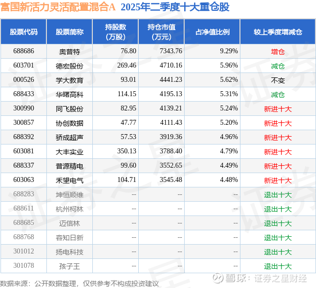根据2025基金半年报公募基金重仓股数据,重仓该股的公募基金共11家,其中持有数量最多的公募基金为富国基金的富国新活力灵活配置混合A。富国新活力灵活配置混合A目前规模为3.79亿元,最新净值3.2889(9月26日),较上一交易日下跌3.15%,近一年上涨59.05%。该公募基金现任基金经理为吴栋栋。吴栋栋在任的基金产品包括:富国质量成长6个月持有混合A,管理时间为2022年2月28日至今,期间收益率为44.92%;富国核心优势混合发起式A,管理时间为2023年12月1日至今,期间收益率为78.17%。