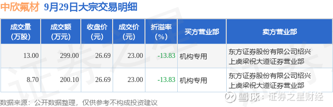 证券之星消息,9月29日中欣氟材发生大宗交易,交易数据如下: