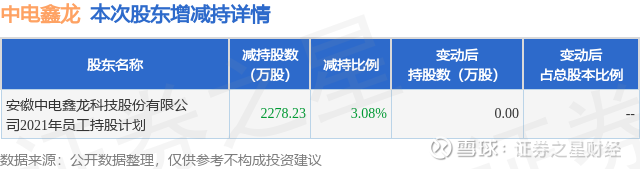 证券之星消息,9月29日中电鑫龙发布公告《中电鑫龙:关于员工持股计划股份减持完毕的公告》,其股东安徽中电鑫龙科技股份有限公司2021年员工持股计划于2025年9月1日至2025年9月29日间合计减持2278.23万股,占公司目前总股本的3.0782%,变动期间该股股价上涨7.73%,截止9月29日收盘报11.99元。