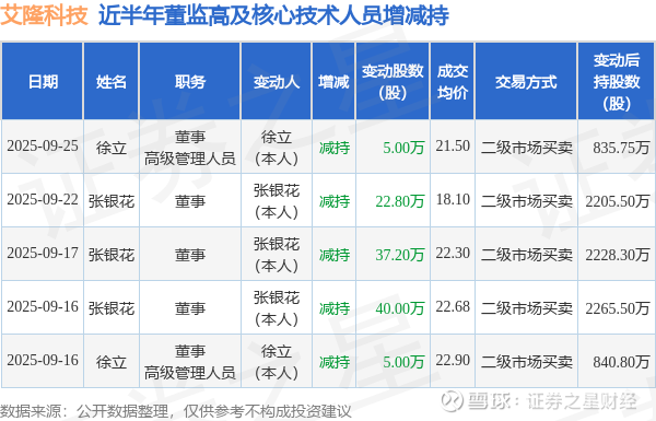艾隆科技近半年内的董监高及核心技术人员增减持详情如下: