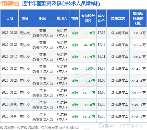 证券之星消息,根据9月29日市场公开信息、上市公司公告及交易所披露数据整理,恒润股份(603985)最新董监高及相关人员股份变动情况:2025年9月26日公司董事,高级管理人员周洪亮共减持公司股份17.28万股,占公司总股本为0.0392%。变动期间公司股价下跌0.86%,9月26日当日收盘报17.2元。