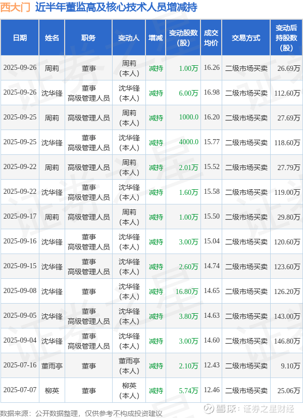 西大门近半年内的董监高及核心技术人员增减持详情如下: