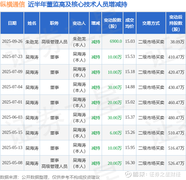 纵横通信近半年内的董监高及核心技术人员增减持详情如下: