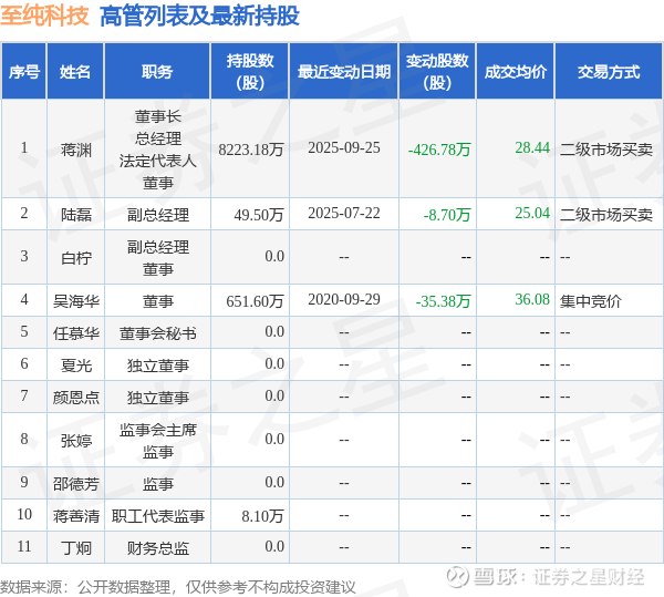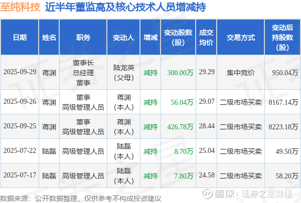 至纯科技近半年内的董监高及核心技术人员增减持详情如下: