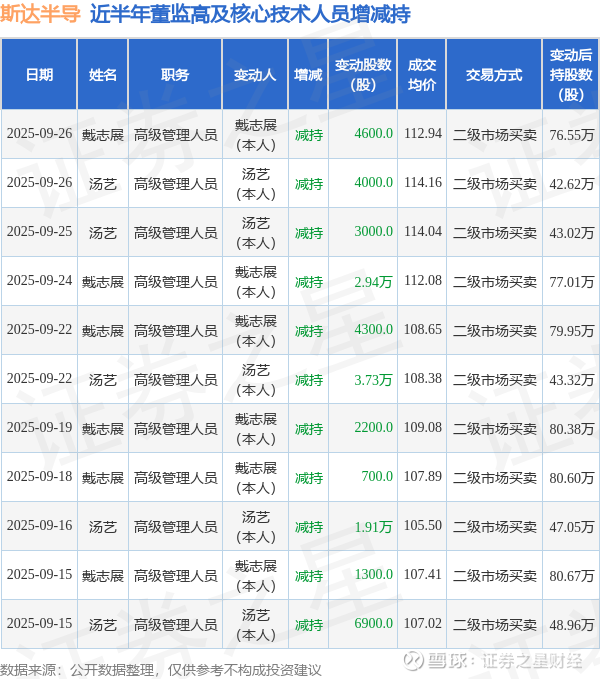 证券之星消息,根据9月29日市场公开信息、上市公司公告及交易所披露数据整理,斯达半导(603290)最新董监高及相关人员股份变动情况:2025年9月26日公司高级管理人员戴志展、高级管理人员汤艺共减持公司股份8600.0股,占公司总股本为0.0036%。变动期间公司股价上涨0.18%,9月26日当日收盘报111.93元。