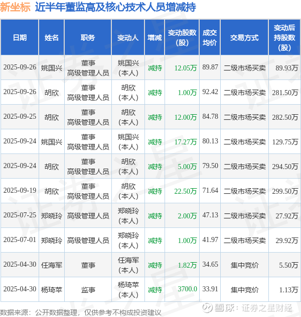 新坐标近半年内的董监高及核心技术人员增减持详情如下: