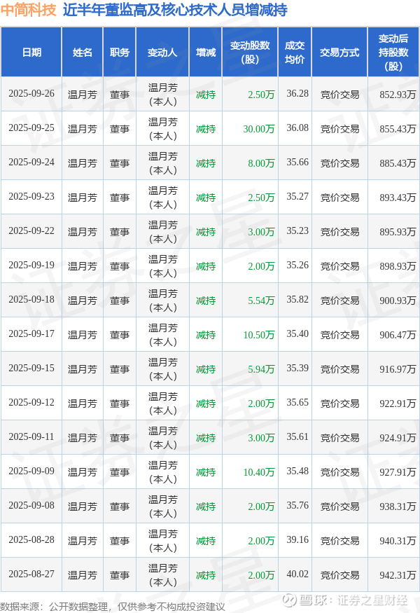 中简科技近半年内的董监高及核心技术人员增减持详情如下: