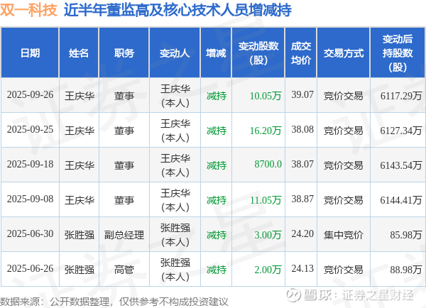 双一科技近半年内的董监高及核心技术人员增减持详情如下: