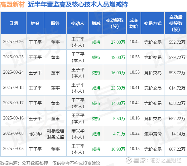 证券之星消息,根据9月29日市场公开信息、上市公司公告及交易所披露数据整理,高盟新材(300200)最新董监高及相关人员股份变动情况:2025年9月26日公司董事王子平共减持公司股份27.0万股,占公司总股本为0.0626%。变动期间公司股价下跌1.82%,9月26日当日收盘报10.26元。
