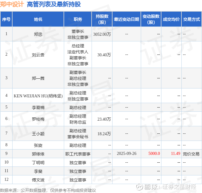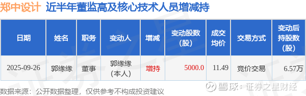 证券之星消息,根据9月29日市场公开信息、上市公司公告及交易所披露数据整理,郑中设计(002811)最新董监高及相关人员股份变动情况:2025年9月26日公司董事郭缘缘共增持公司股份5000.0股,占公司总股本为0.0016%。变动期间公司股价上涨2.67%,9月26日当日收盘报11.91元。