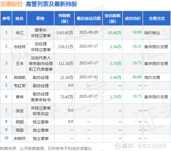 亚康股份近半年内的董监高及核心技术人员增减持详情如下: