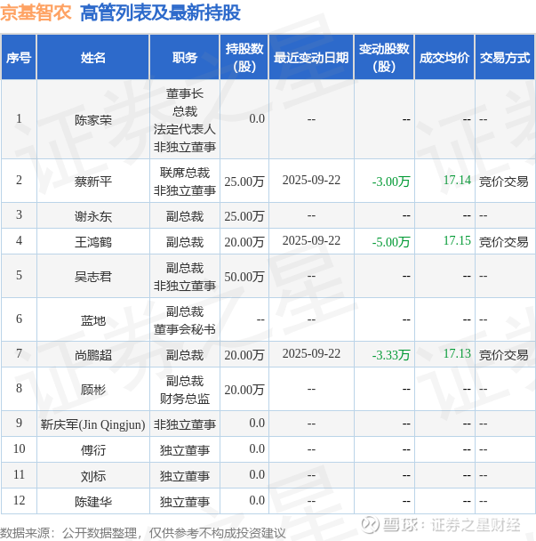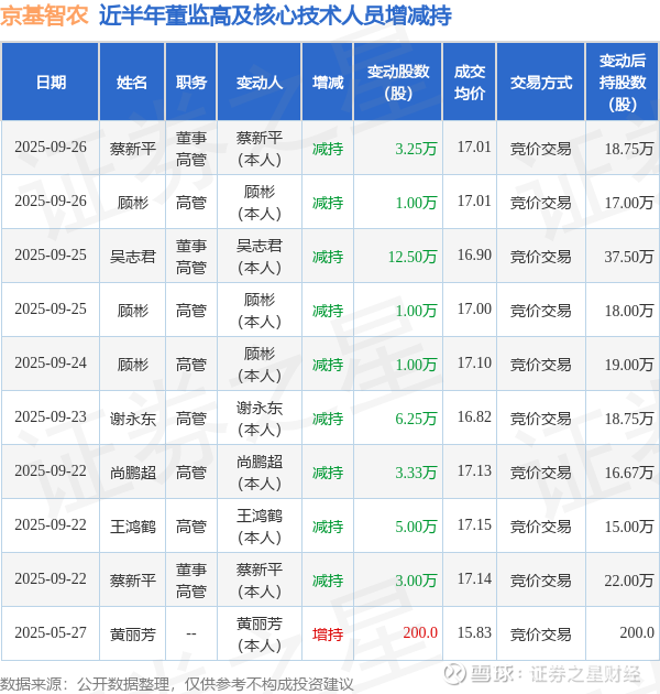 京基智农近半年内的董监高及核心技术人员增减持详情如下: