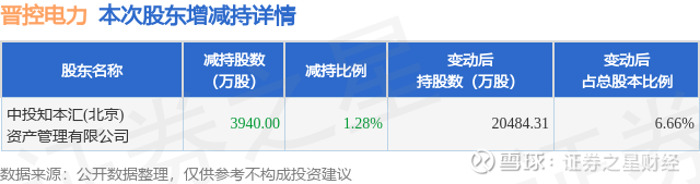 证券之星消息,9月29日晋控电力发布公告《晋控电力:关于持股5%以上股东减持股份触及1%的公告》,其股东中投知本汇(北京)资产管理有限公司于2025年9月25日至2025年9月26日间合计减持3940.0万股,占公司目前总股本的1.2805%,变动期间该股股价下跌2.73%,截止9月26日收盘报2.85元。