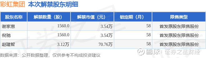 证券之星消息,根据市场公开信息整理,彩虹集团(003023)于9月30日将有3.43万股限售股份解禁,为公司首发原股东限售股份,占公司总股本0.03%。(本次数据根据历史公告整理得出,实际情况以上市公司最新公告为准)最近一年内,该股累计解禁5274.14万股,占总股本的50.07%。本次解禁后,公司还有23.95万股限售股份,占总股本0.23%。具体如下图所示: