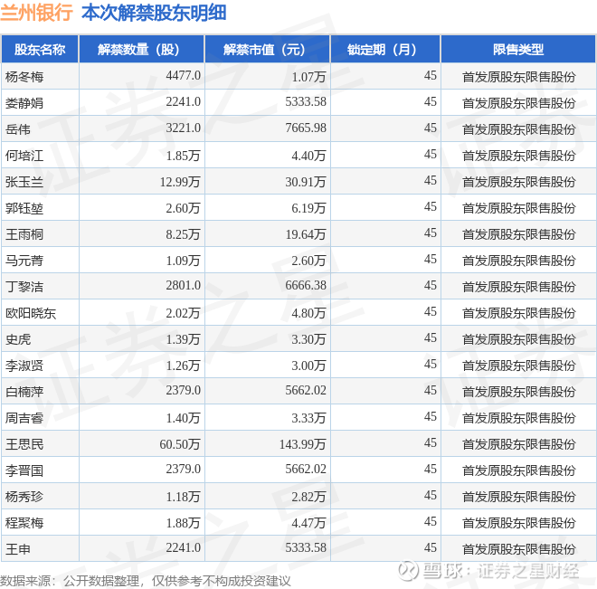 证券之星消息,根据市场公开信息整理,兰州银行(001227)于9月30日将有98.38万股限售股份解禁,为公司首发原股东限售股份,占公司总股本0.02%。(本次数据根据历史公告整理得出,实际情况以上市公司最新公告为准)最近一年内,该股累计解禁14.44亿股,占总股本的25.35%。本次解禁后,公司还有14.83亿股限售股份,占总股本26.03%。具体如下图所示:
