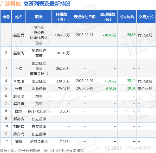 广脉科技近半年内的董监高及核心技术人员增减持详情如下: