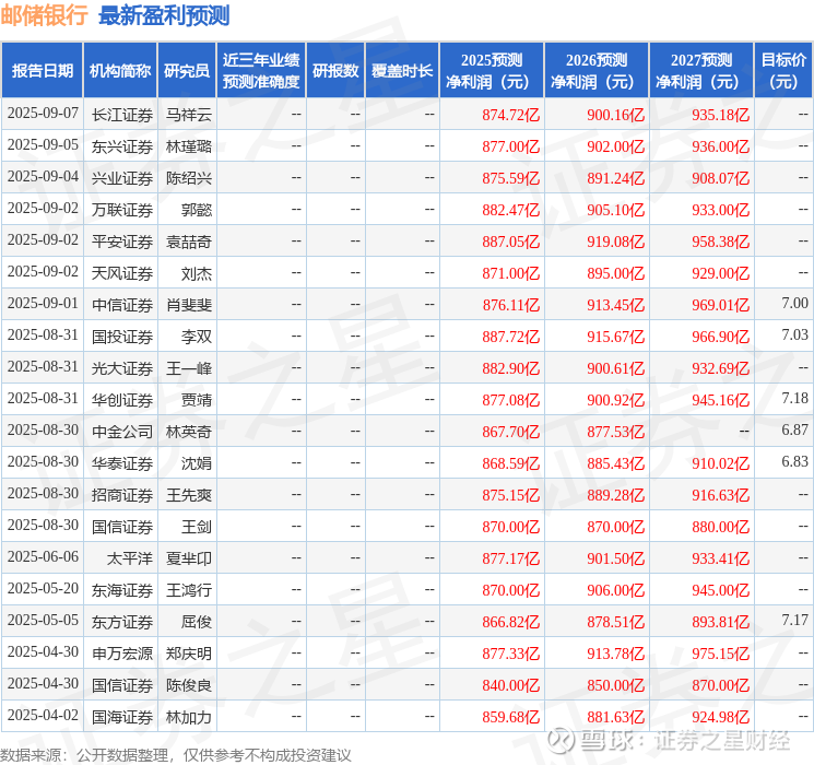 东海证券股份有限公司王鸿行近期对邮储银行进行研究并发布了研究报告《公司简评报告:非息收入亮眼,储蓄代理费率调整效果显现》,给予邮储银行增持评级。