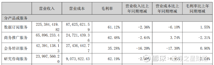 证券之星注意到,数据订阅服务、商务推广服务、研究咨询服务的毛利率均在60%以上,但过低的收入占比使其难以拉动业绩增长。