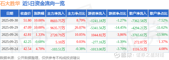 证券之星消息,石大胜华9月30日涨停收盘,收盘价51.8元。该股于9点43分涨停,5次打开涨停,截止收盘封单资金为3293.96万元,占其流通市值0.31%。