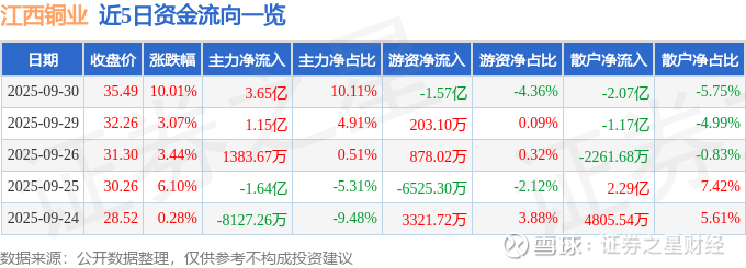 证券之星消息,江西铜业9月30日涨停收盘,收盘价35.49元。该股于14点4分涨停,3次打开涨停,截止收盘封单资金为2498.11万元,占其流通市值0.03%。