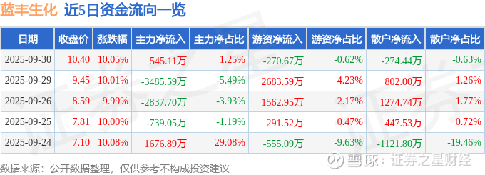 证券之星消息,蓝丰生化9月30日涨停收盘,收盘价10.4元。该股于9点31分涨停,1次打开涨停,截止收盘封单资金为2.28亿元,占其流通市值8.27%。