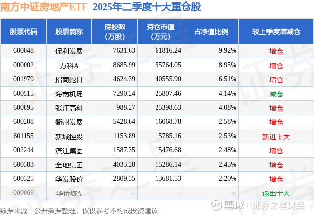 根据2025基金半年报公募基金重仓股数据,重仓该股的公募基金共10家,其中持有数量最多的公募基金为南方基金的南方中证房地产ETF。南方中证房地产ETF目前规模为62.32亿元,最新净值1.6108(9月29日),较上一交易日上涨0.91%,近一年上涨10.21%。该公募基金现任基金经理为罗文杰。罗文杰在任的基金产品包括:南方中证500ETF联接(LOF)A,管理时间为2013年4月22日至今,期间收益率为141.6%;南方中证500ETF,管理时间为2013年4月22日至今,期间收益率为149.28%;南方沪深300ETF,管理时间为2013年5月17日至今,期间收益率为146.7%;南方沪深300ETF联接A,管理时间为2013年5月17日至今,期间收益率为133.51%。