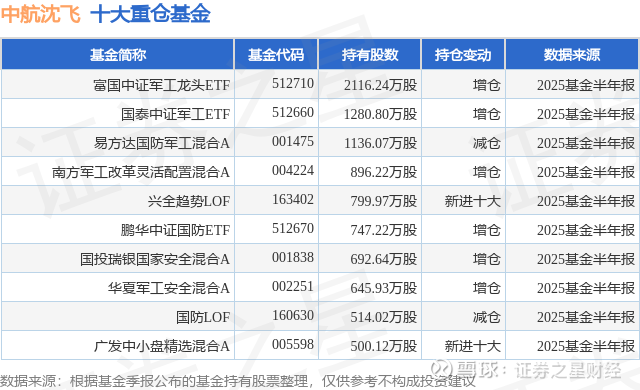 根据2025基金半年报公募基金重仓股数据,重仓该股的公募基金共185家,其中持有数量最多的公募基金为富国基金的富国中证军工龙头ETF。富国中证军工龙头ETF目前规模为119.14亿元,最新净值0.6974(9月29日),较上一交易日上涨0.63%,近一年上涨24.18%。该公募基金现任基金经理为王乐乐 牛志冬。王乐乐在任的基金产品包括:富国央企创新ETF,管理时间为2019年9月20日至今,期间收益率为70.8%;富国中证消费50ETF,管理时间为2019年10月14日至今,期间收益率为19.56%;富国中证科技50策略ETF,管理时间为2019年11月15日至今,期间收益率为92.13%。牛志冬在任的基金产品包括:富国中证移动互联网指数(LOF)A,管理时间为2015年5月13日至今,期间收益率为-2.42%;富国中证医药主题指数增强A,管理时间为2016年11月11日至今,期间收益率为51.17%;富国中证娱乐主题指数增强(LOF)A,管理时间为2017年3月13日至今,期间收益率为-16.8%;