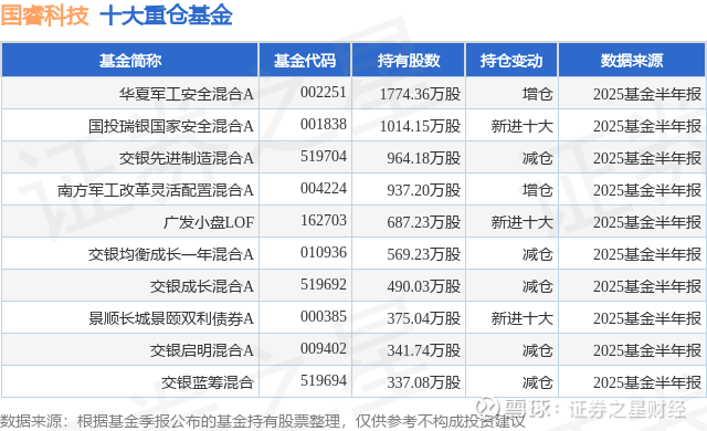 根据2025基金半年报公募基金重仓股数据,重仓该股的公募基金共51家,其中持有数量最多的公募基金为华夏基金的华夏军工安全混合A。华夏军工安全混合A目前规模为44.86亿元,最新净值1.792(9月29日),较上一交易日上涨1.01%,近一年上涨46.41%。该公募基金现任基金经理为万方方。