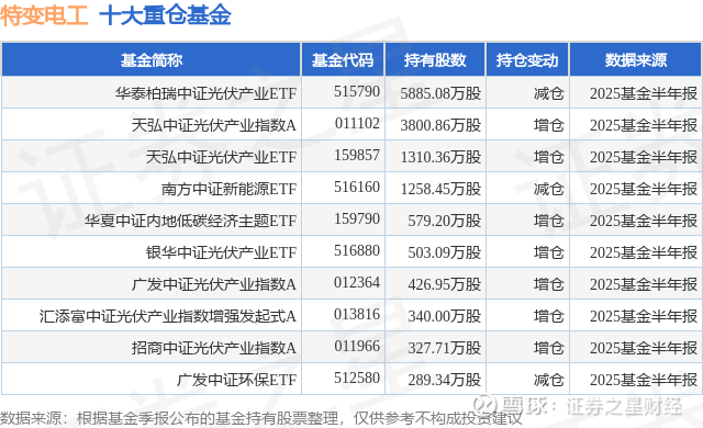 根据2025基金半年报公募基金重仓股数据,重仓该股的公募基金共46家,其中持有数量最多的公募基金为华泰柏瑞基金的华泰柏瑞中证光伏产业ETF。华泰柏瑞中证光伏产业ETF目前规模为99.84亿元,最新净值0.9427(9月29日),较上一交易日上涨2.03%,近一年上涨27.44%。该公募基金现任基金经理为李茜 李沐阳。李茜在任的基金产品包括:华泰柏瑞上证红利ETF,管理时间为2019年11月5日至今,期间收益率为45.22%;华泰柏瑞中证港股通50ETF,管理时间为2020年12月30日至今,期间收益率为18.24%;华泰柏瑞中证物联网主题ETF,管理时间为2021年3月31日至今,期间收益率为40.42%。李沐阳在任的基金产品包括:华泰柏瑞光伏ETF联接A,管理时间为2021年8月17日至今,期间收益率为-43.27%;华泰柏瑞中韩半导体ETF(QDII),管理时间为2022年11月2日至今,期间收益率为124.98%;华泰柏瑞纳斯达克100ETF(QDII),管理时间为2023年3月1日至今,期间收益率为99.94%。