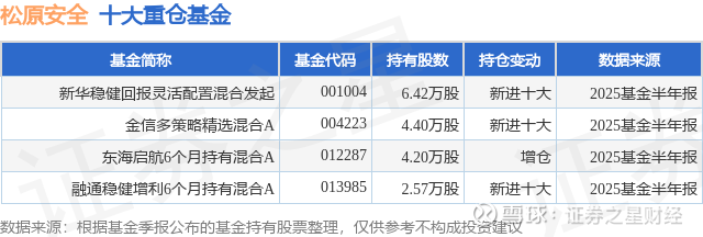 根据2025基金半年报公募基金重仓股数据,重仓该股的公募基金共4家,其中持有数量最多的公募基金为新华基金的新华稳健回报灵活配置混合发起。新华稳健回报灵活配置混合发起目前规模为0.53亿元,最新净值1.4815(9月29日),较上一交易日上涨1.2%,近一年上涨11.92%。该公募基金现任基金经理为俞佳莹。