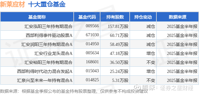 根据2025基金半年报公募基金重仓股数据,重仓该股的公募基金共7家,其中持有数量最多的公募基金为汇安基金的汇安泓阳三年持有期混合。汇安泓阳三年持有期混合目前规模为8.51亿元,最新净值1.3889(9月29日),较上一交易日上涨2.91%,近一年上涨86.48%。该公募基金现任基金经理为邹唯。邹唯在任的基金产品包括:汇安裕阳三年持有期混合,管理时间为2018年9月27日至今,期间收益率为133.34%;汇安行业龙头混合A,管理时间为2019年8月28日至今,期间收益率为138.99%;汇安均衡优选混合,管理时间为2021年2月9日至今,期间收益率为14.11%。