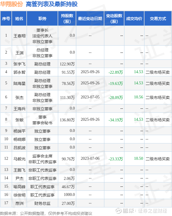 华翔股份近半年内的董监高及核心技术人员增减持详情如下: