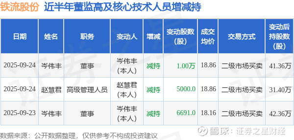 铁流股份近半年内的董监高及核心技术人员增减持详情如下: