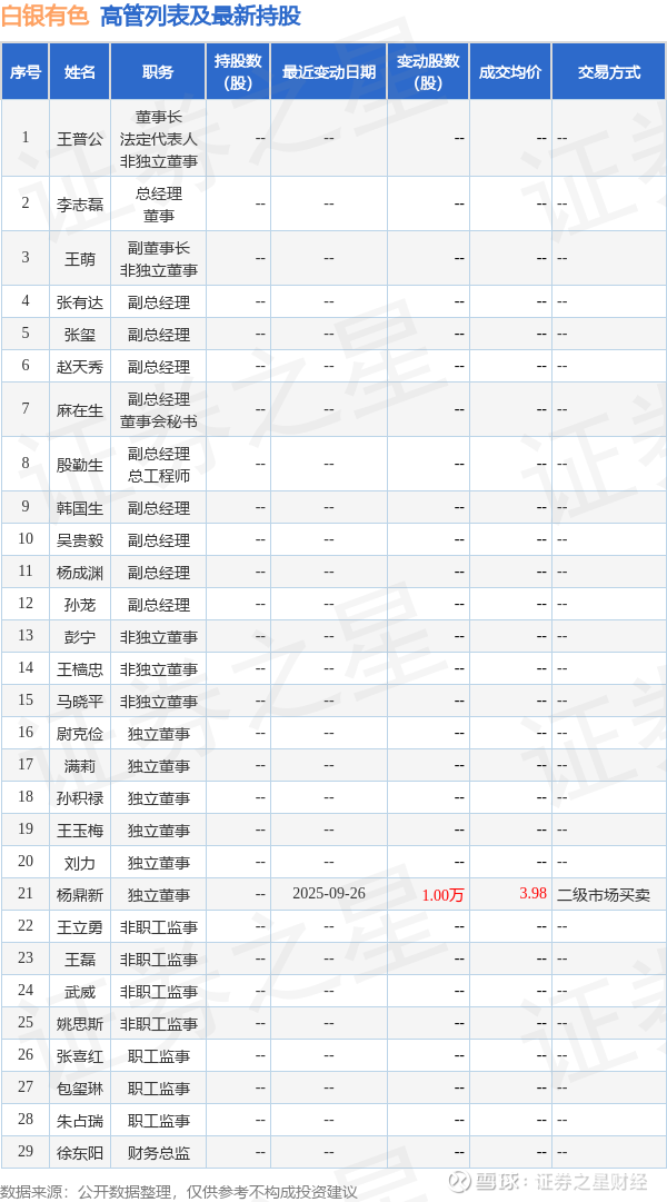 证券之星消息,根据9月30日市场公开信息、上市公司公告及交易所披露数据整理,白银有色(601212)最新董监高及相关人员股份变动情况:2025年9月26日公司董事杨鼎新共增持公司股份1.0万股,占公司总股本为0.0001%。变动期间公司股价上涨3.46%,9月26日当日收盘报3.89元。