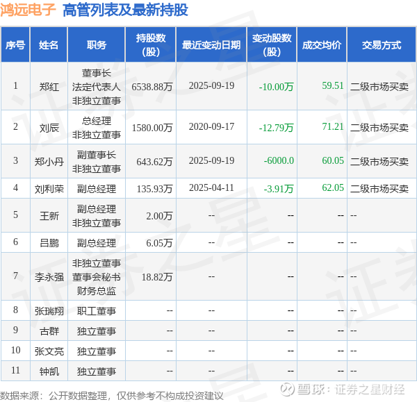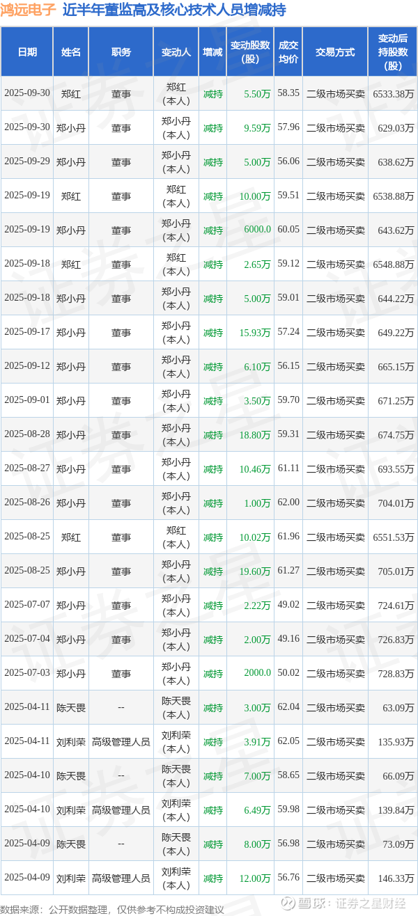 鸿远电子近半年内的董监高及核心技术人员增减持详情如下:
