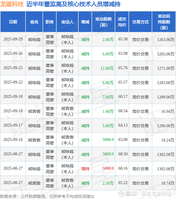 证券之星消息,根据9月30日市场公开信息、上市公司公告及交易所披露数据整理,龙磁科技(300835)最新董监高及相关人员股份变动情况:2025年9月29日公司董事,高管熊咏鸽共减持公司股份2.0万股,占公司总股本为0.0168%。变动期间公司股价上涨2.29%,9月29日当日收盘报64.44元。