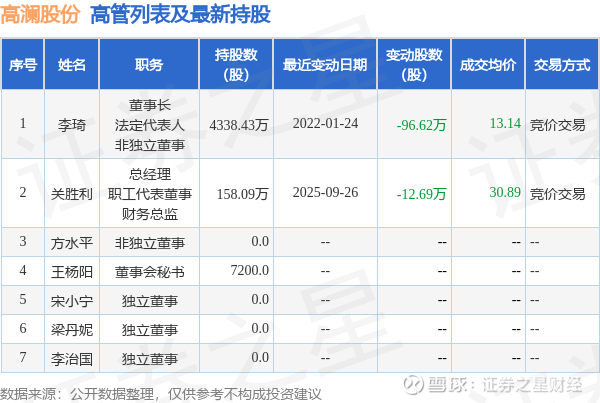 证券之星消息,根据9月30日市场公开信息、上市公司公告及交易所披露数据整理,高澜股份(300499)最新董监高及相关人员股份变动情况:2025年9月29日公司董事,高管关胜利共减持公司股份29.5万股,占公司总股本为0.0966%。变动期间公司股价上涨4.81%,9月29日当日收盘报32.26元。