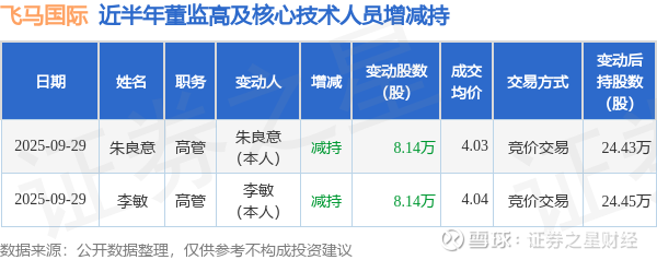 证券之星消息,根据9月30日市场公开信息、上市公司公告及交易所披露数据整理,飞马国际(002210)最新董监高及相关人员股份变动情况:2025年9月29日公司高管李敏、高管朱良意共减持公司股份16.28万股,占公司总股本为0.0062%。变动期间公司股价上涨2.52%,9月29日当日收盘报4.07元。