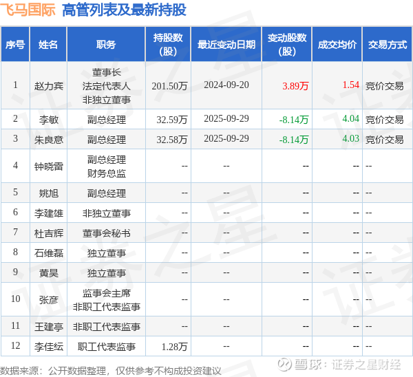 飞马国际近半年内的董监高及核心技术人员增减持详情如下:
