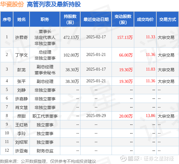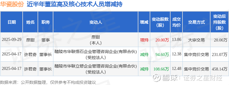 华瓷股份近半年内的董监高及核心技术人员增减持详情如下: