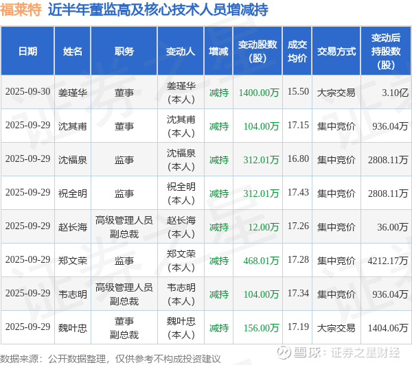 福莱特近半年内的董监高及核心技术人员增减持详情如下: