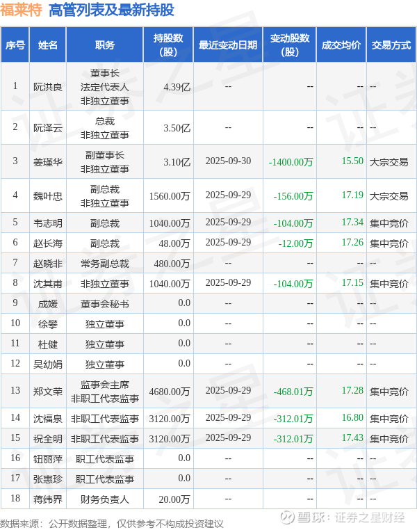 福莱特的高管列表及最新持股情况如下: